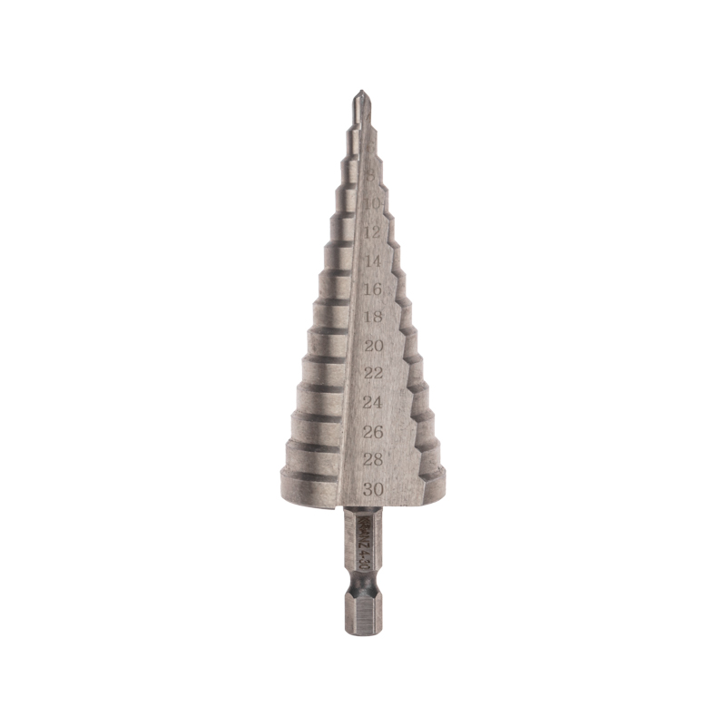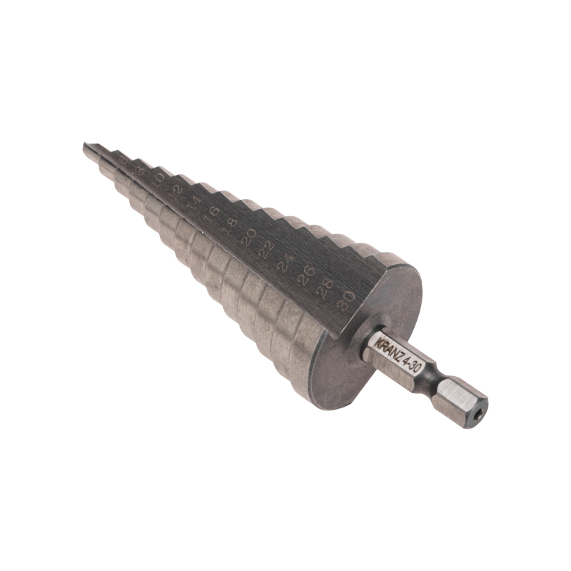 На каждой из 14 ступеней сверла нанесена маркировка фактического диаметра. Диапазон ступеней: 4, 6, 8, 10, 12, 14, 16, 18, 20, 22, 24, 26, 28, 30 (шаг 2 мм).