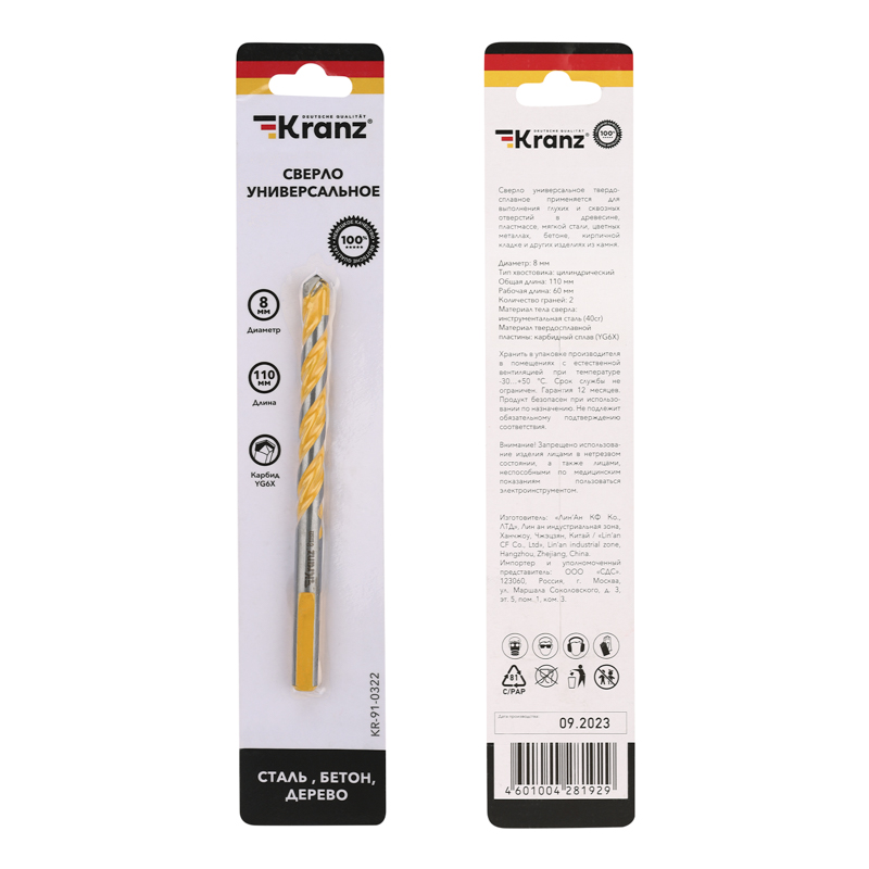 Сверло универсальное твердосплавное, 8мм KRANZ