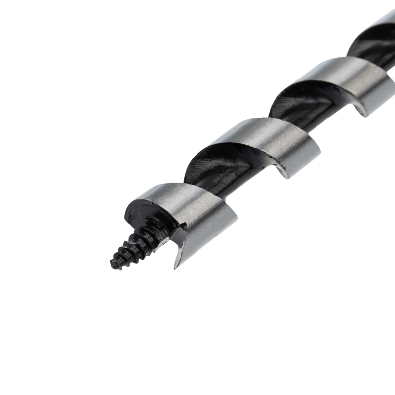 Сверло выполнено из закаленной инструментальной стали, что повышает износостойкость и долговечность инструмента. Центрирующее острие на конце рабочей части позволяет удобно засверливаться в материал и уменьшает осевую нагрузку, шнековая спираль Левиса обработана до зеркального блеска, из-за чего отверстия получаются гладкими, а стружка отводится более эффективно. Хвостовая часть, выполненная в виде шестигранника, надежно фиксирует сверло в патроне инструмента.