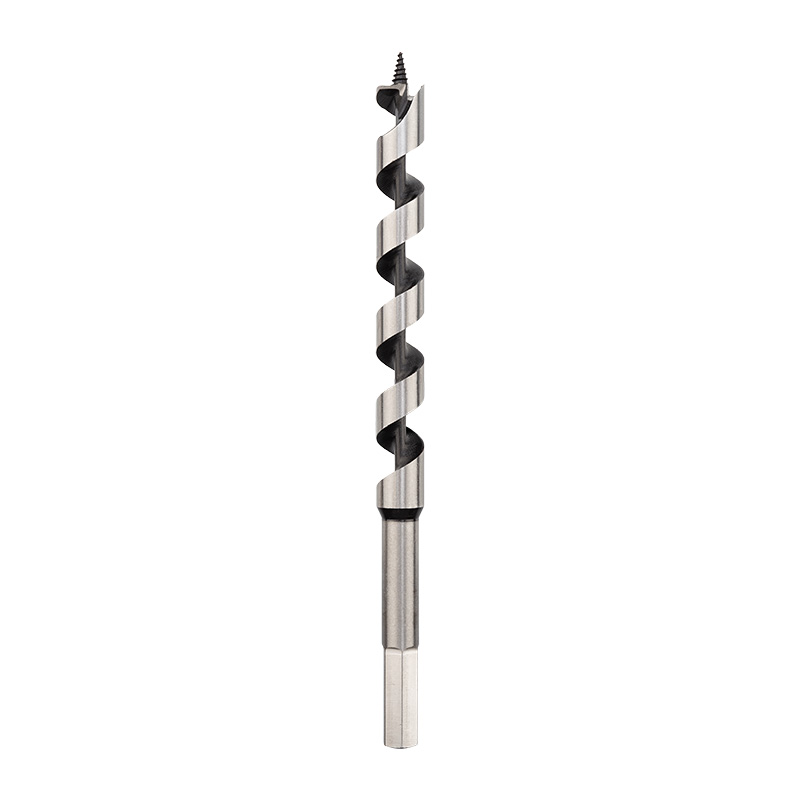 Сверло выполнено из закаленной инструментальной стали, что повышает износостойкость и долговечность инструмента. Центрирующее острие на конце рабочей части позволяет удобно засверливаться в материал и уменьшает осевую нагрузку, шнековая спираль Левиса обработана до зеркального блеска, из-за чего отверстия получаются гладкими, а стружка отводится более эффективно. Хвостовая часть, выполненная в виде шестигранника, надежно фиксирует сверло в патроне инструмента.