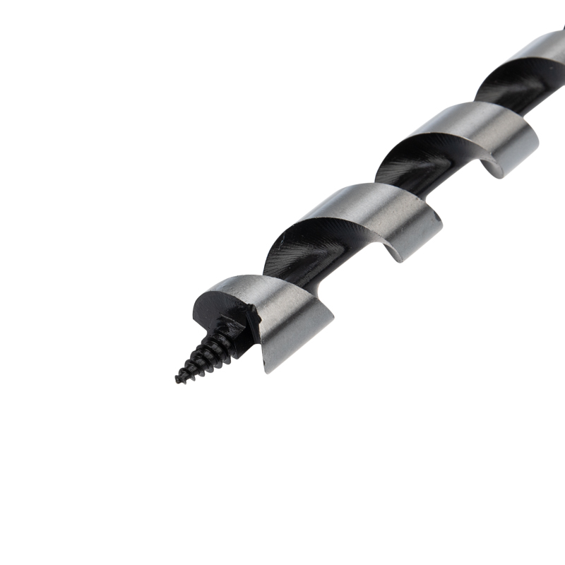 Сверло выполнено из закаленной инструментальной стали, что повышает износостойкость и долговечность инструмента. Центрирующее острие на конце рабочей части позволяет удобно засверливаться в материал и уменьшает осевую нагрузку, шнековая спираль Левиса обработана до зеркального блеска, из-за чего отверстия получаются гладкими, а стружка отводится более эффективно. Хвостовая часть, выполненная в виде шестигранника, надежно фиксирует сверло в патроне инструмента.