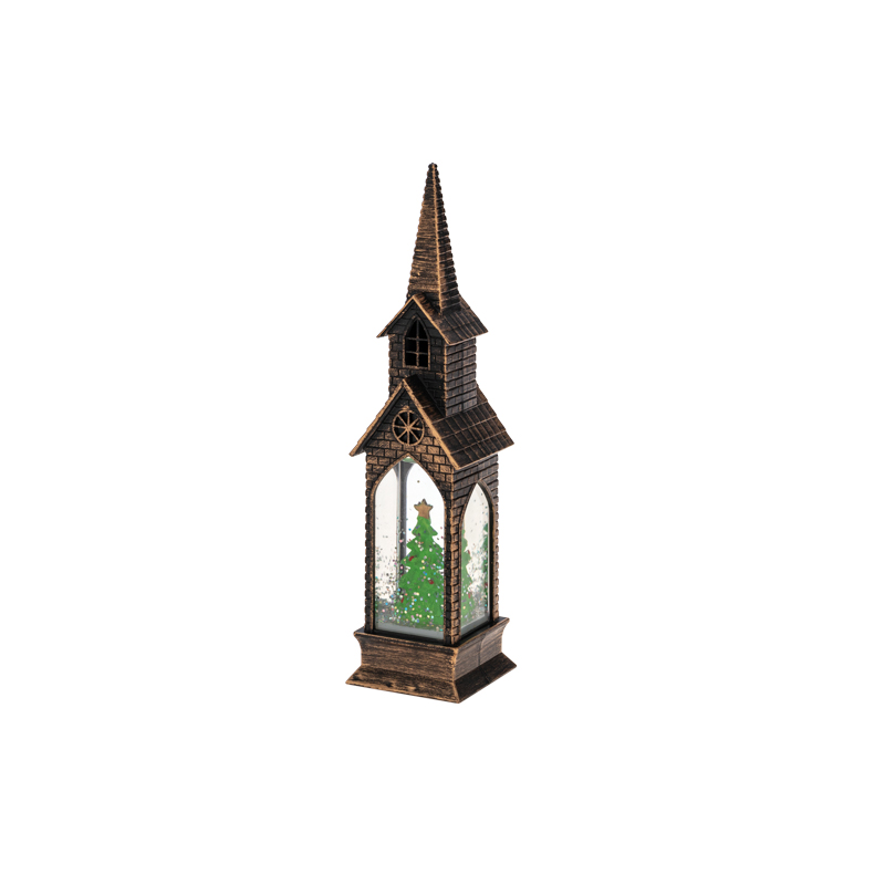 Светильник с эффектом снегопада и подсветкой выполнен в бронзовом цвете, внутри находится фигурка Новогодней елки.