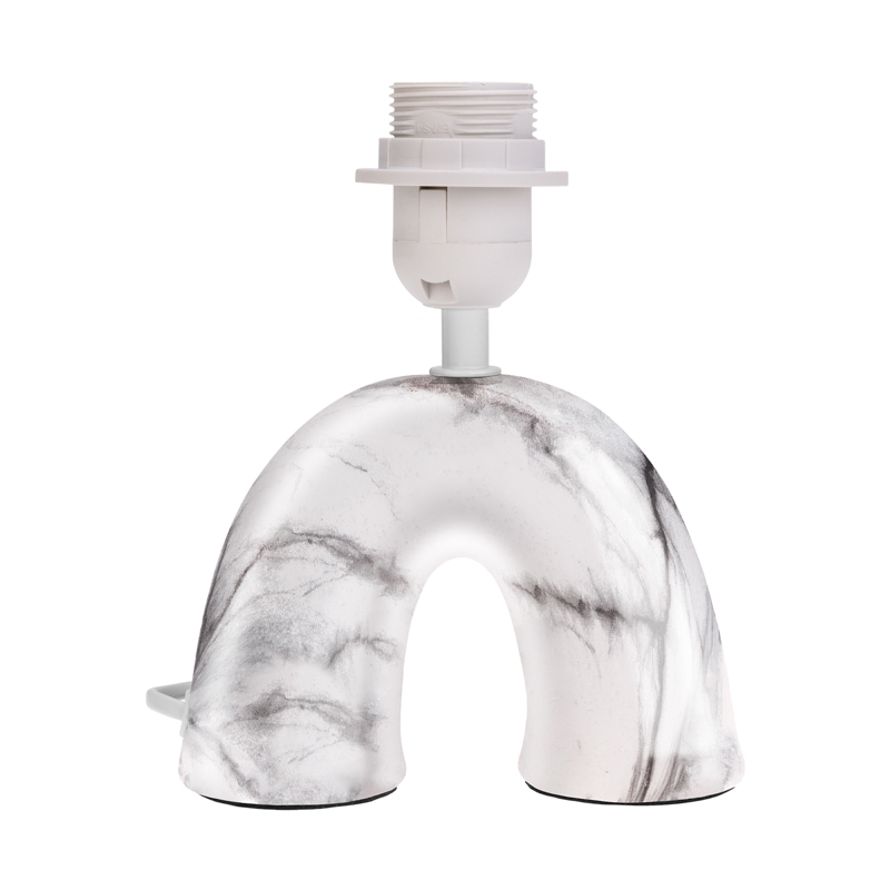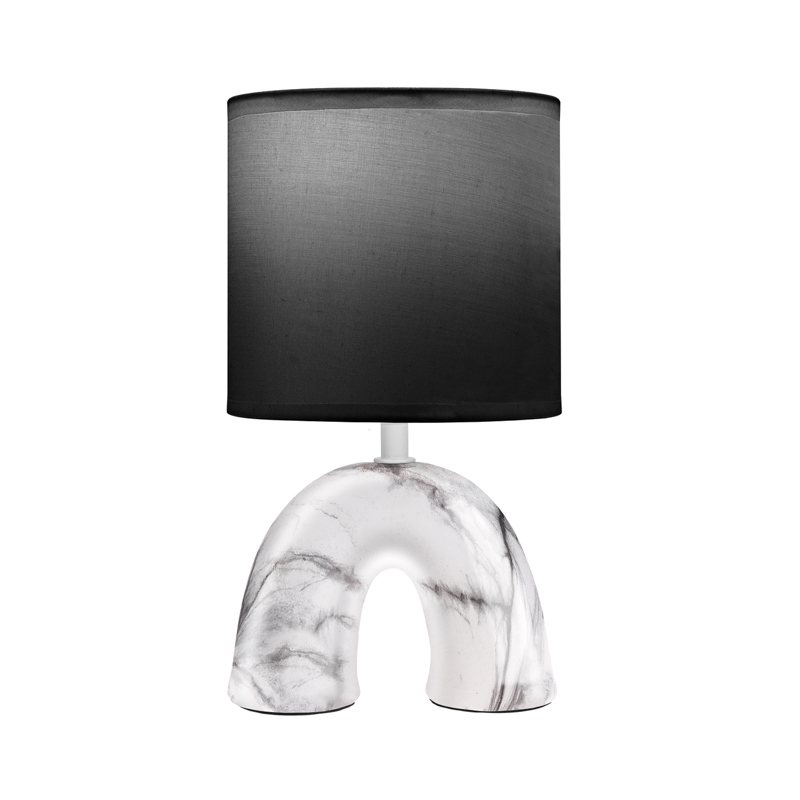 Декоративный настольный светильник с основанием в форме дуги под под белый мрамор и черным абажуром станет современным и стильным интерьерным украшением.