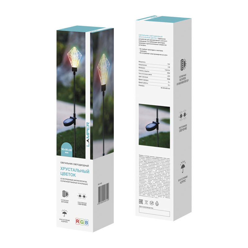Светодиодный светильник «Хрустальный Цветок» LAMPER может использоваться в качестве газонного источника света. Он способен украсить пространство и гармонично смотрится при любом архитектурном стиле. Оснащен встроенным аккумулятором и солнечной панелью. Благодаря высокому качеству используемых материалов изделие имеет долгий срок службы.