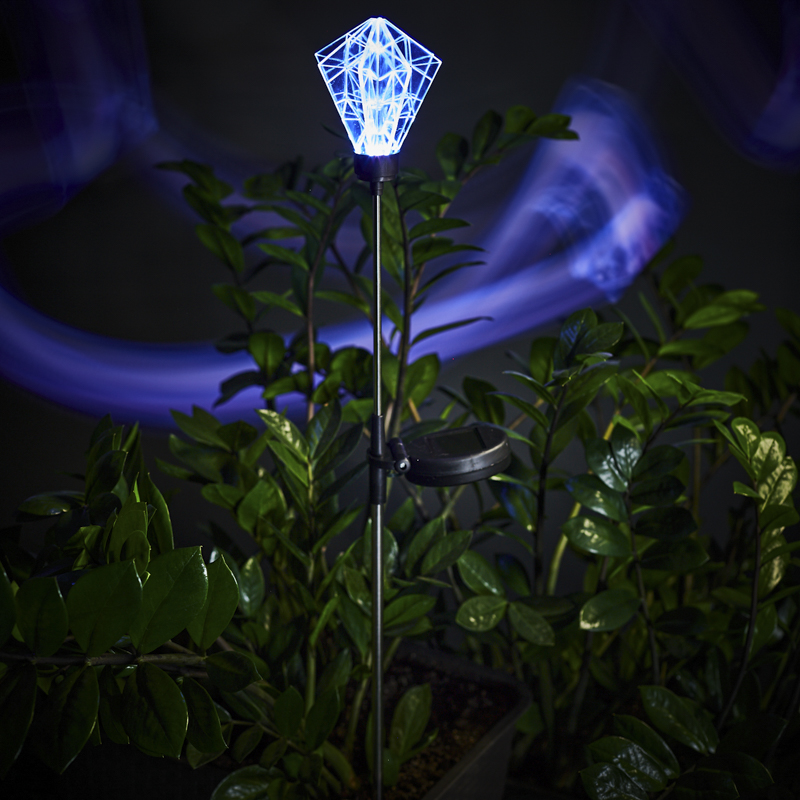 Степень пылевлагозащиты IP65 позволяет устанавливать изделие в неблагоприятных условиях и защищает устройство от любых негативных воздействий окружающей среды. Большим преимуществом является скорость и простота монтажа, а также отсутствие необходимости в прокладке проводов, так как светильник работает от солнечной энергии. Цвет свечения – RGB.