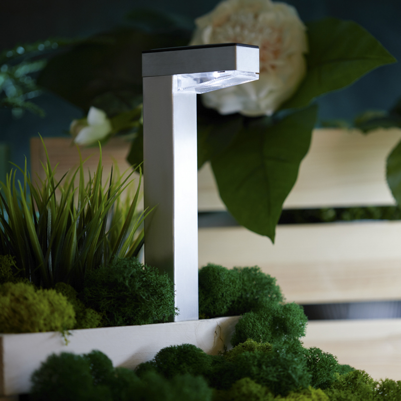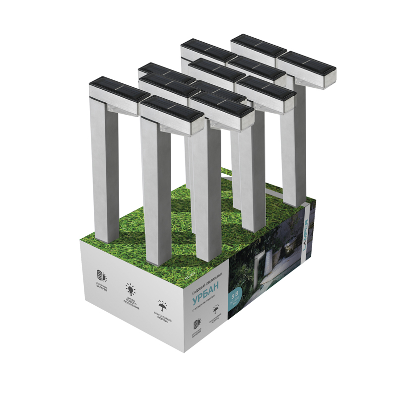 Оснащен встроенной солнечной панелью и аккумулятором. Не требует прокладки проводов благодаря автономности. В дневное время светильник заряжается от солнечного света, а в ночное освещает пространство вокруг. Цвет свечения – белый (4000 К).
