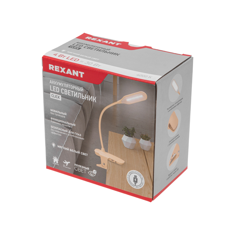 Светильник настольный Click 4Вт, LED, 4000К, диммируемый 3 ступени, заряжаемый, на прищепке, кремовый REXANT
