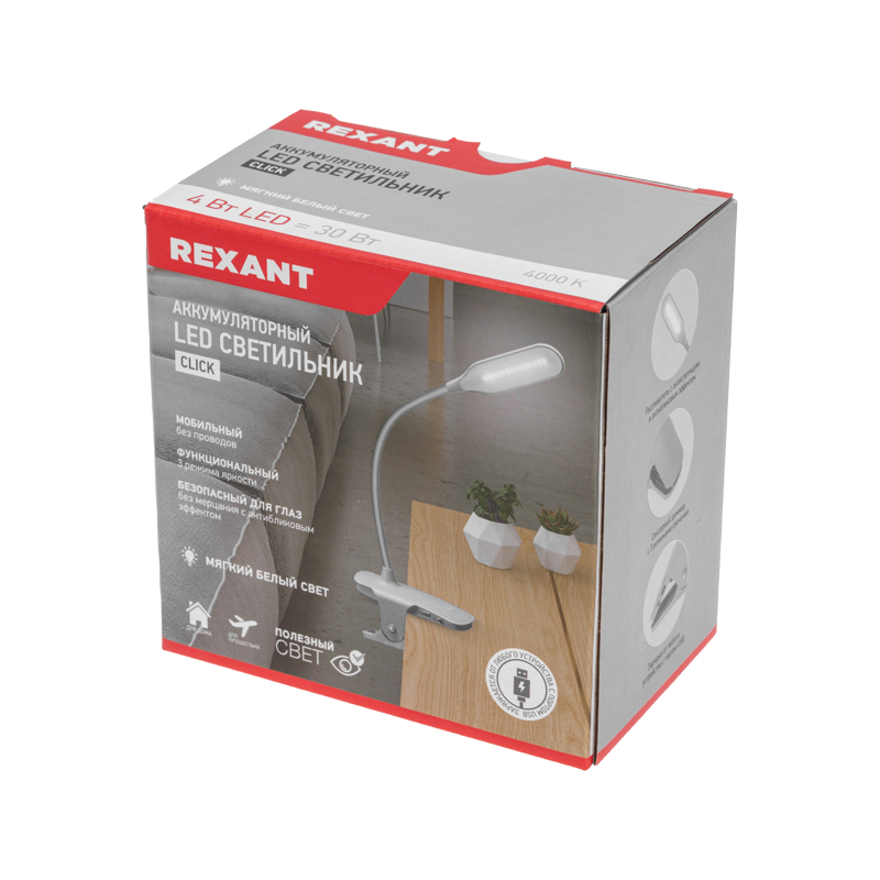Светильник настольный Click 4Вт, LED, 4000К, диммируемый 3 ступени, заряжаемый, на прищепке, синий REXANT