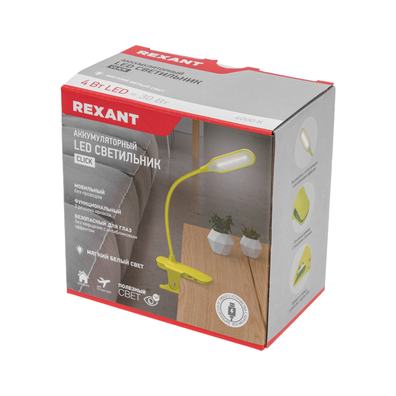 Светильник настольный Click 4Вт, LED, 4000К, диммируемый 3 ступени, заряжаемый, на прищепке, зеленый REXANT