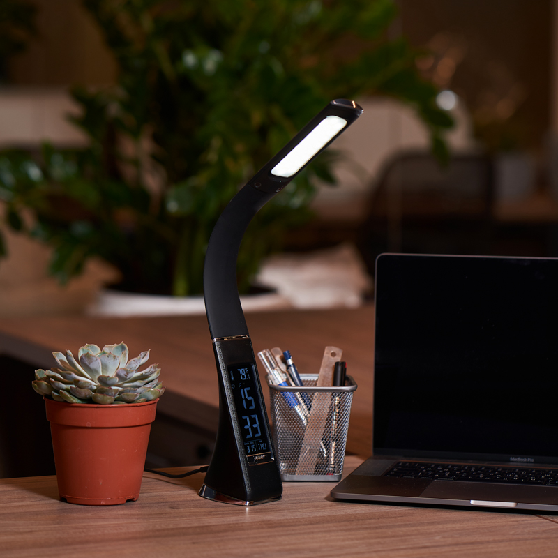 Светильник с цветовой температурой 4000 К оснащен цифровым дисплеем, отображающим дату, время, температуру в помещении и день недели.