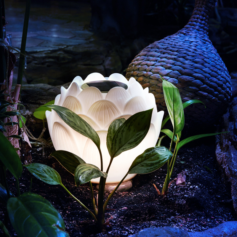 Светильник Лотос – это изысканный элемент садового декора, предназначенный для создания дополнительного освещения или акцентной подсветки. Может быть установлен на террасе, веранде, под деревом, возле пруда или среди других растений.