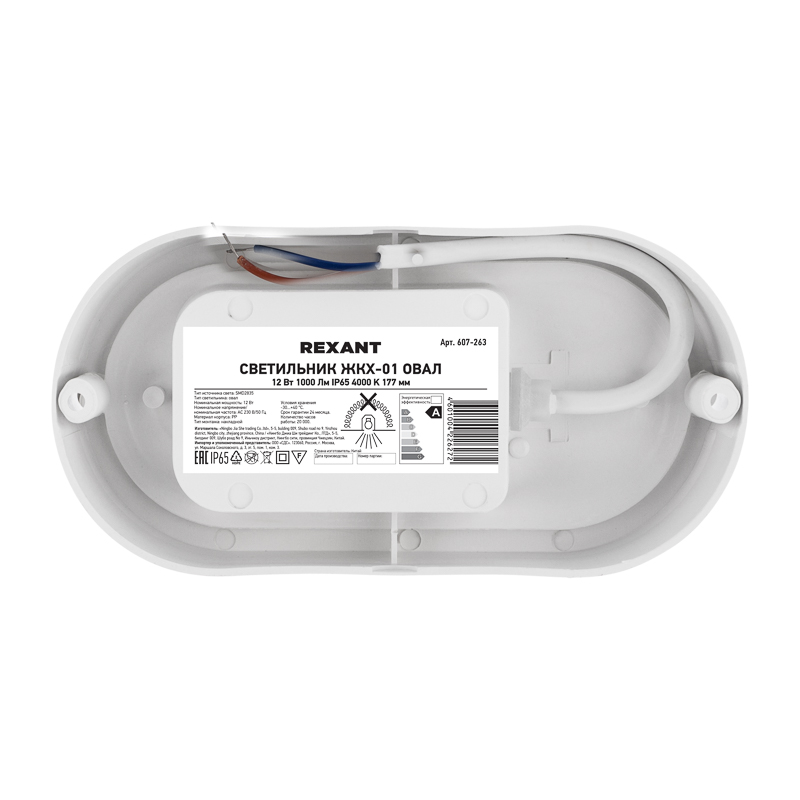 Светильник REXANT серии ЖКХ оснащен долговечным светодиодным источником света номинальной мощностью 12 Вт и световым потоком 1140 Лм.