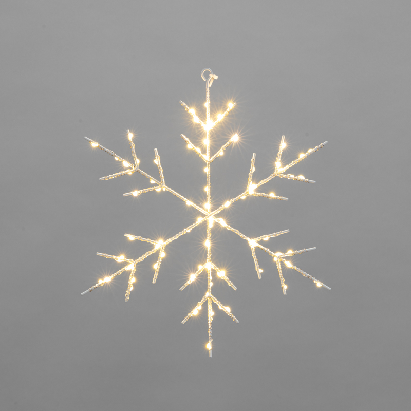 Светодиодная подвесная фигура «Снежинка» станет незаменимым украшением во время зимних праздников и гармонично дополнит интерьер детской, гостиной или кухни, а также может стать прекрасным новогодним подарком родным и близким. Фигура наполнит помещение ярким теплым белым свечением и подарит праздничное настроение взрослым и детям. Снежинка может быть подвешена в любом подходящем месте при помощи кольца, которое находится на металлическом каркасе. Фигура полностью автономна и безопасна в использовании, так как ее питание обеспечивают 2 батарейки типа АА (не входят в комплект). Батарейный блок расположен на конце 30-сантиметрового кабеля и не портит внешний вид фигуры.
