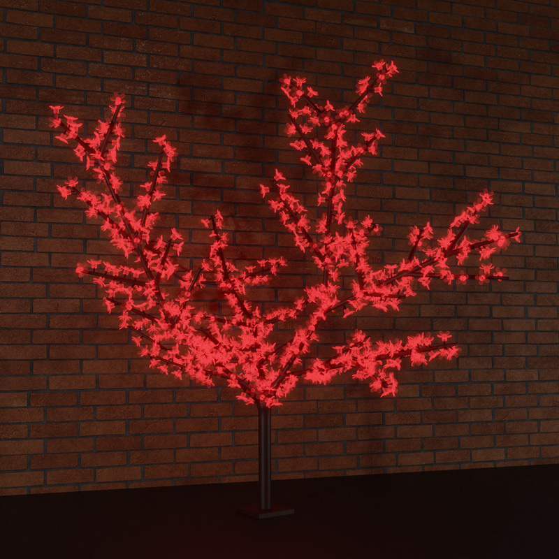 Светодиодное дерево «Сакура» высотой 1,5 метра с 864 декоративными цветами создано, чтобы эффектно украсить интерьер или уличное пространство. Оригинальная композиция в виде японской вишни подсвечивается красными диодами, работающими в постоянном режиме. Крона диаметром 1,8 метра состоит из аккуратных реалистичных ветвей, выполненных из черного ПВХ. Вся конструкция имеет полноценную влагозащиту IP65 — подходит для размещения как дома, так и на улице. Ствол устанавливается в прочное основание с отверстиями под анкерный крепеж. Для подключения в электросеть предусмотрен понижающий трансформатор.