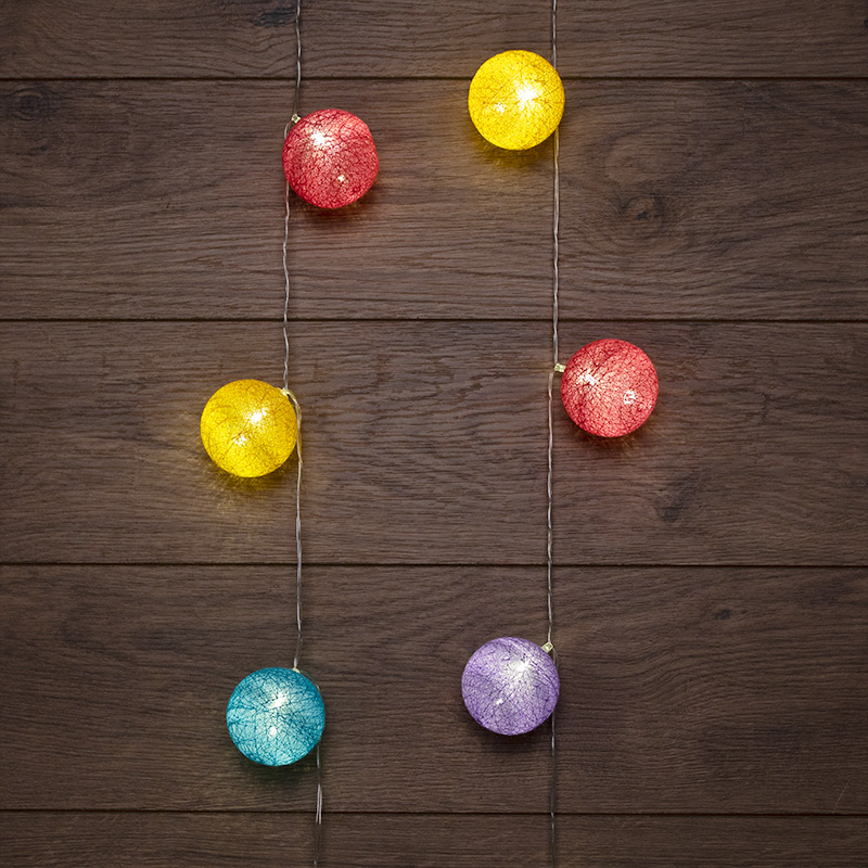 Тайские фонарики «Фейерверк» — эффектная светодиодная гирлянда со степенью защиты IP20 в необычном исполнении. 10 диодов находятся внутри круглых фонариков из хлопковой нити, купол которых мягко рассеивает яркий поток, создавая атмосферу комфорта и уюта. Текстильные декоративные элементы красного, голубого, фиолетового и желтого цветов станут стильным украшением детской, спальни, фотозоны даже в выключенном состоянии. Гирлянда питается от трех элементов типа АА и может использоваться в качестве ночного освещения в спальнях, детских комнатах.