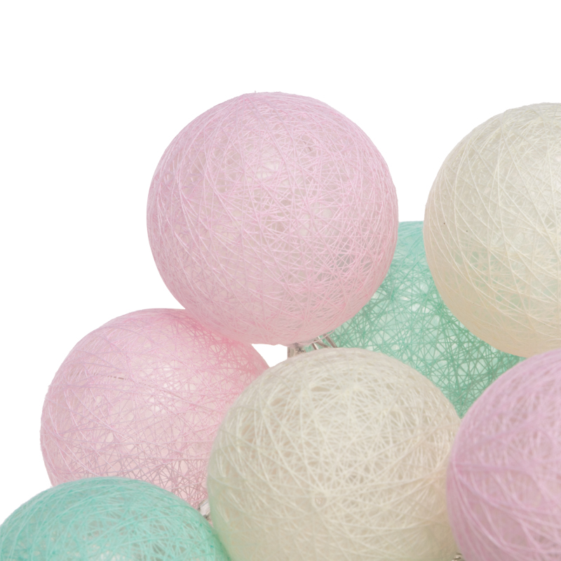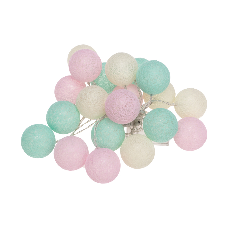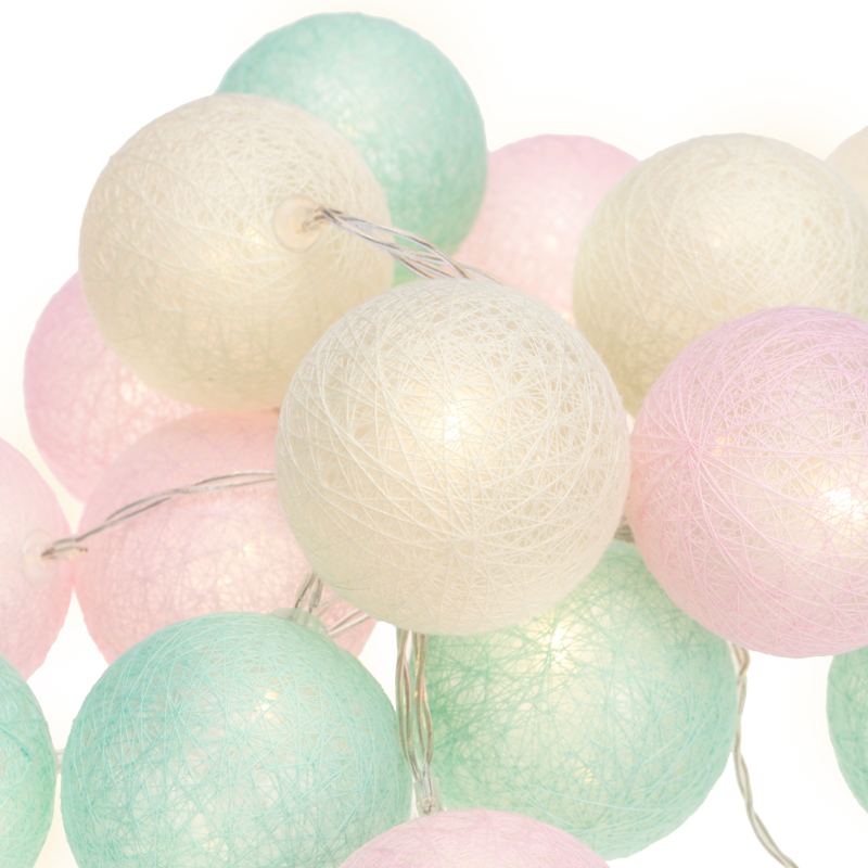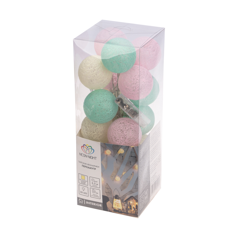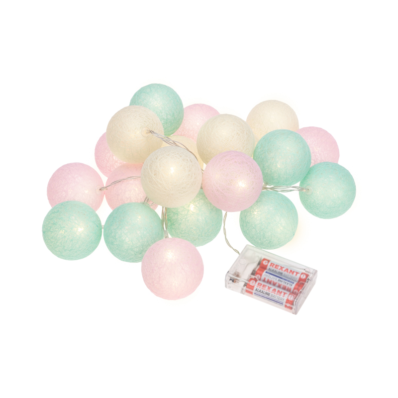 Тайские фонарики «Перламутр» — необычная светодиодная гирлянда длиной 3,5 метра, украшенная круглыми декоративными элементами в виде шариков, выполненных из хлопковой нити. Внутри каждого фонарика находится диод, излучающий теплый белый свет — всего в конструкции 20 диодов. Текстильный купол мягко рассеивает яркий поток, создавая уютное магическое свечение. Гирлянда, получающая питание от 3 батареек типа АА, поможет эффектно оформить карниз, гардину, спинку кровати, горшечное растение и любые другие интерьерные объекты, находящиеся вдали от розеток. Изделия на батарейках отлично подходят для украшения детских комнат благодаря безопасности использования.