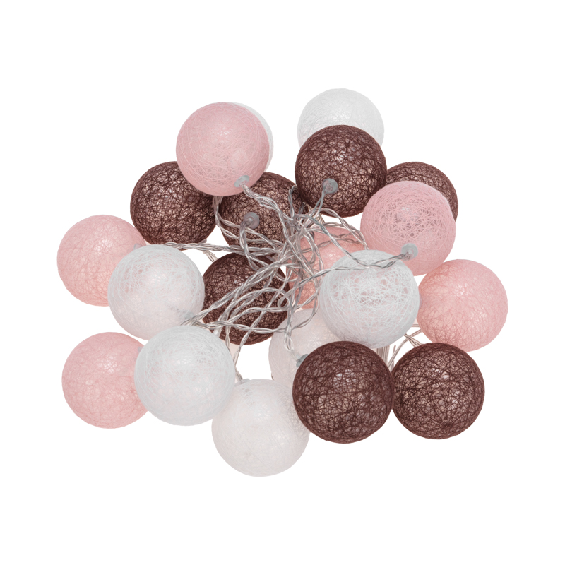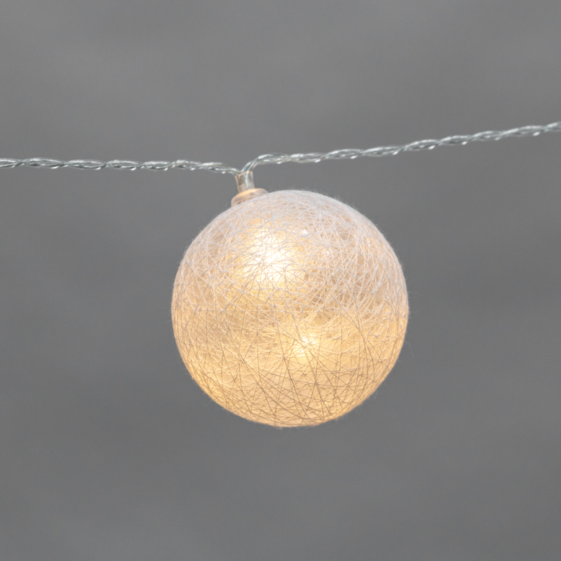 На проводе, помещенном в прозрачную изоляцию из ПВХ, находятся 20 волшебных круглых фонариков из хлопковых нитей.