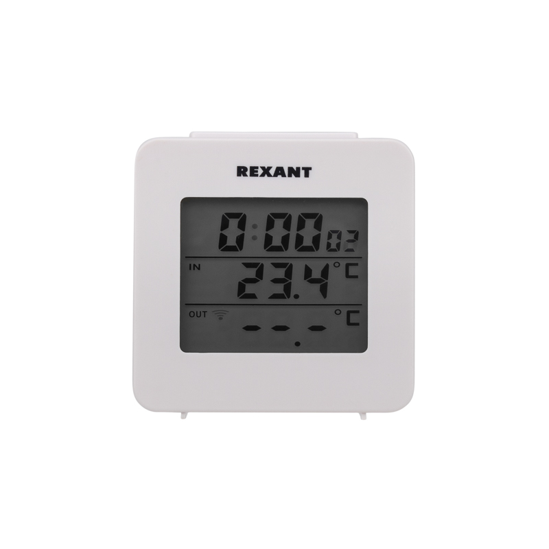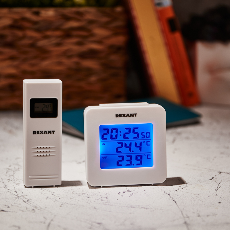 Электронный термометр REXANT с часами и беспроводным выносным датчиком предназначен для измерения показаний температуры внутри и снаружи помещений.