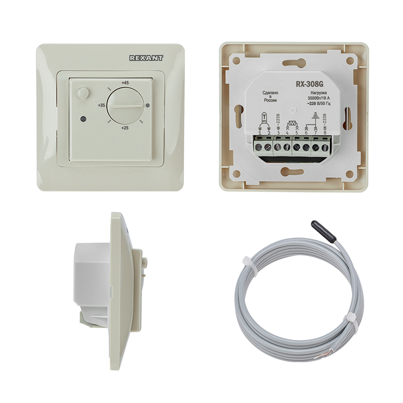Механический термостат RX-308G от REXANT бежевого цвета обеспечивает регулировку температуры в диапазоне от +15°C до +45°C. Имеет высокую коммутационную способность контактов до 16 А (3500 Вт), что позволяет использовать его для управления большим количеством электроприборов.
