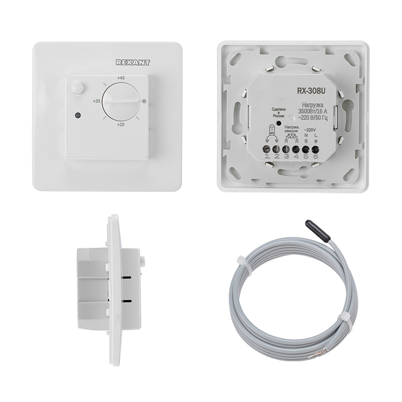 Механический термостат RX-308U от REXANT белого цвета обеспечивает регулировку температуры в диапазоне от +15°C до +45°C. Имеет высокую коммутационную способность контактов до 16 А (3500 Вт), что позволяет использовать его для управления большим количеством электроприборов.