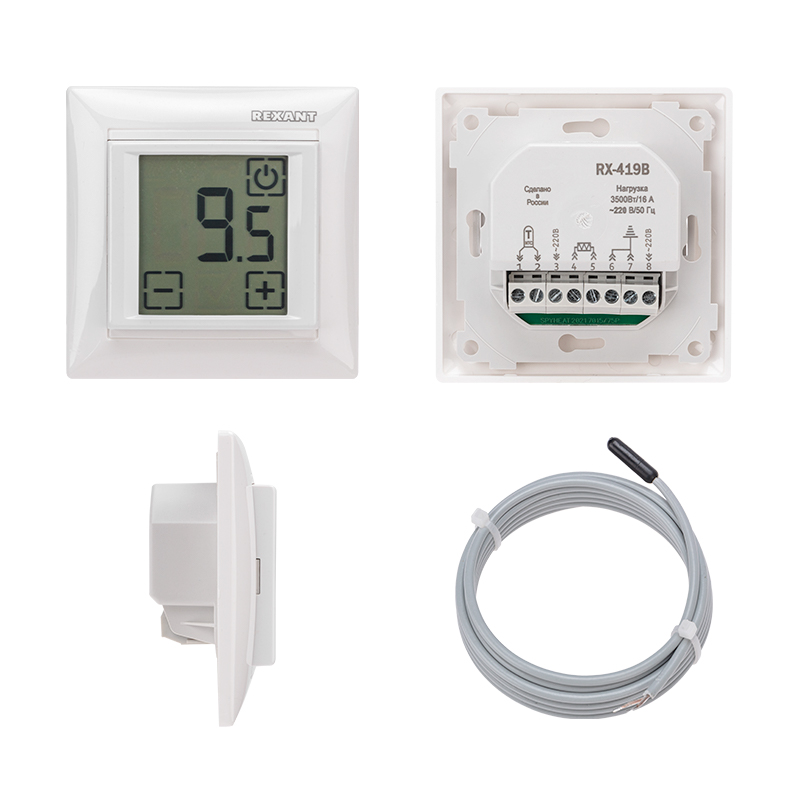 Электронный термостат RX-419B REXANT - это встраиваемое устройство в белом корпусе, которое оснащено сенсорным экраном. Предназначено для регулировки температуры в помещении в диапазоне от +15 до +45 °C.