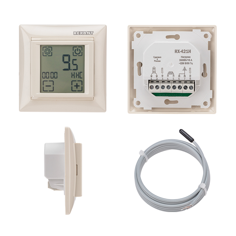 Электронный термостат RX-421H REXANT - это встраиваемое устройство в бежевом корпусе, которое оснащено сенсорным экраном. Предназначено для регулировки температуры в помещении в диапазоне от +15 до +45 °C.
