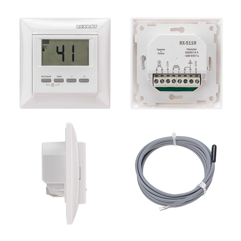 Цифровой терморегулятор RX-511H REXANT белого цвета разработан для точного контроля температуры пола с максимальной нагрузкой 3500Вт/16А. Он отличается высоким качеством и надежностью, а также выполнен в строгом и минималистичном дизайне. Обеспечивает регулировку температуры в диапазоне от +5°C до +40°C