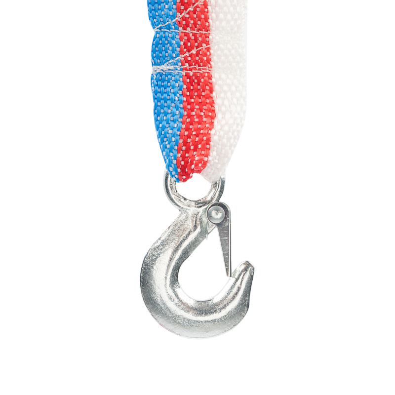 Трос изготовлен из полипропилена, отличающегося стойкостью к низким температурам и резкому изменению влажности. На концах изделия расположены металлические крюки с пружинным фиксатором.