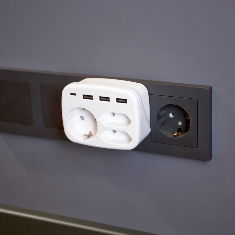 Многофункциональный электрический тройник с быстрой зарядкой - это удобное и стильное устройство, позволяющее подать питание от одной сетевой розетки сразу на три электроприбора 220-250 В (с одной стандартной Евро-вилкой и два прибора с узкой вилкой: бра, торшеры, ночники) и одновременно 4 USB-разъема питания для зарядки портативных устройств. Идеально подходит для бытовой техники: кофемашины, тостера, электрической зубной щетки, фена, а также и для мобильного телефона, наушников и т.д.
