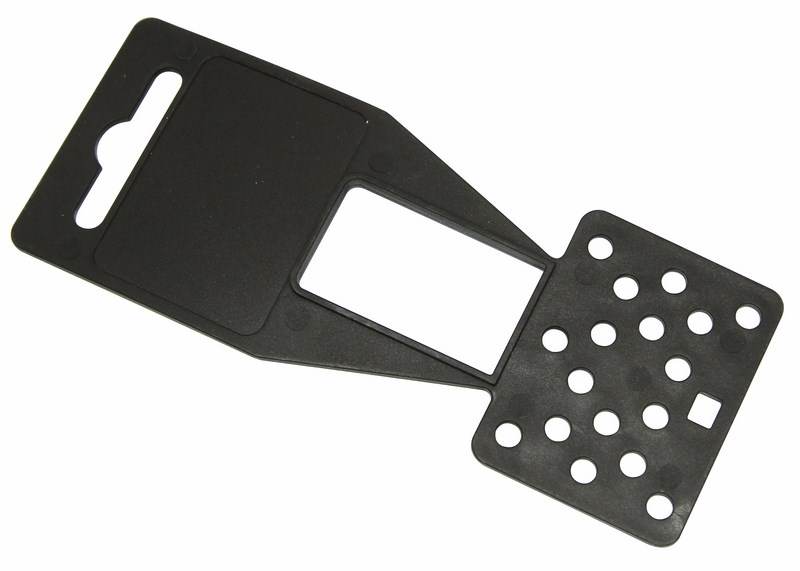 Ценникодержатель предназначен для удобного крепления товара к рекламным и торговым стендам. В верхней части ценникодержателя есть специальное отверстие (евровырубка), с помощью которого ценникодержатель крепится на стенде. Ниже выдавлена ниша, в которой размещается ценник размером 31х42. В нижней части изделия проделано несколько отверстий, через которые с помощью стяжек закрепляется товар. Изделие выполнено из черного нейлона.