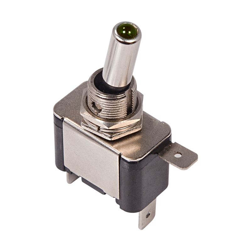 Тумблер 12V 20А (3c) ON-OFF однополюсный с зеленой LED подсветкой предназначен для коммутации электрических цепей напряжением 12В. Такая разновидность переключателей применяется на лицевых панелях в качестве комплектующих изделий различного электрооборудования (в измерительных приборах, блоках питания, электроустановках на различных производствах, легковых и грузовых автомобилях, поездах и многих других местах). Отличительной особенностью тумблера является металлический перекидной переключатель, принцип действия которого основан на его перемещении в одну из позиций. Для переключения в нужное положение требуется приложить некоторые усилия. Монтаж осуществляется без применения винтов на плоских панелях толщиной от 0.8мм до 4мм. Подключение контактов осуществляется с помощью плоских клемм, либо с помощью пайки.