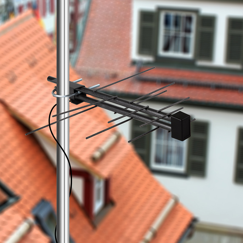 Антенна оснащена встроенным усилителем, предотвращающим помехи от базовых станций сотовой связи и значительно улучшающим прием вещания.