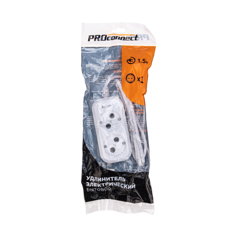 Удлинитель 2 гнезда, 1,5м, 2х0,75мм², б/з, белый PROconnect