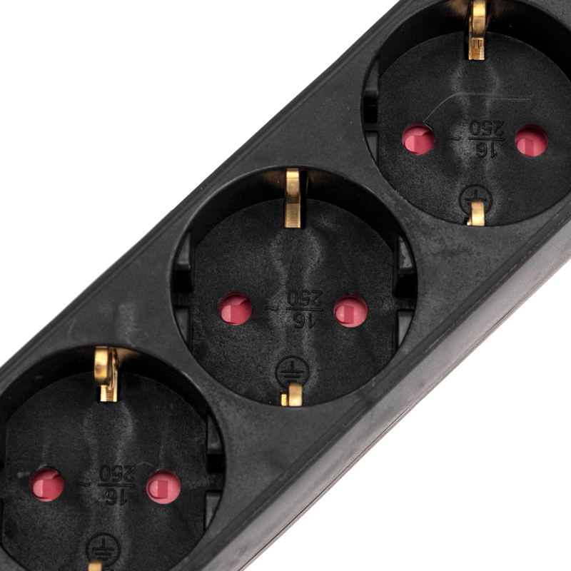 Удлинитель оснащен защитными шторками, которые предназначены для предотвращения случайного попадания пыли, влаги или посторонних предметов в гнезда удлинителя, что способствует долговечности самого устройства и подключенных к нему приборов, а также обеспечивает защиту от поражения электрическим током.