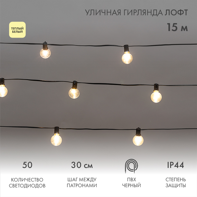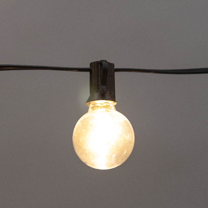 Уличная гирлянда Лофт выполнена на основе гирлянды Белт-Лайт и представляет собой готовый к использованию комплект с уже установленными в патроны прозрачными светодиодными лампами G40 с цоколем E12.