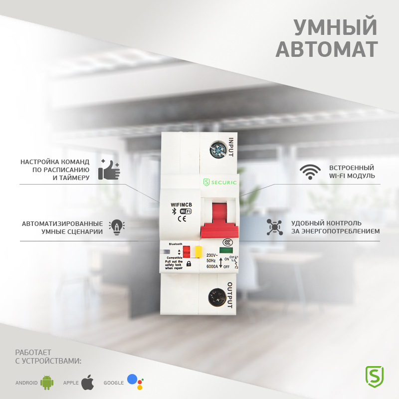 Для работы автоматического выключателя необходимо наличие Wi-Fi сигнала. Устройство быстро и просто устанавливается на DIN-рейку.