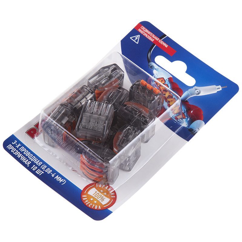 Соединительная многоразовая клемма на 3 проводника с плоско-пружинным зажимом предназначена для подсоединения медных одножильных и многожильных проводников тонкого сечения. Клемма изготовлена из полиамида 66, имеет 3 контакта, цвет корпуса прозрачный, напряжение 400 В.