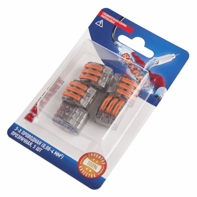Универсальная клемма СМК 222-413, 3-проводная прозрачная 0,08-2,5/4 мм² (блистер 5 шт./уп.) REXANT