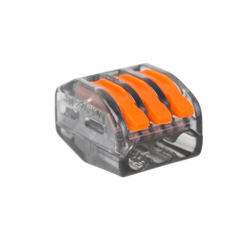 Соединительная многоразовая клемма на 3 проводника с плоско-пружинным зажимом предназначена для подсоединения медных одножильных и многожильных проводников тонкого сечения. Клемма изготовлена из полиамида 66, имеет 3 контакта, цвет корпуса прозрачный, напряжение 400 В.
