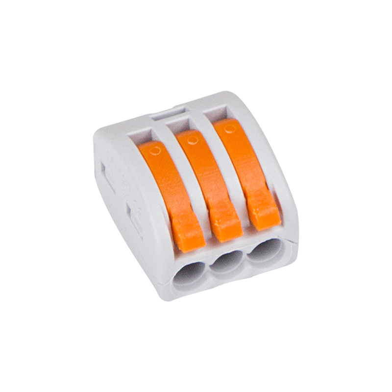 Соединительная многоразовая клемма на 3 проводника с плоско-пружинным зажимом предназначена для подсоединения медных одножильных и многожильных проводников тонкого сечения. Клемма изготовлена из полиамида 66, имеет 3 контакта, цвет корпуса серый, напряжение 400 В.