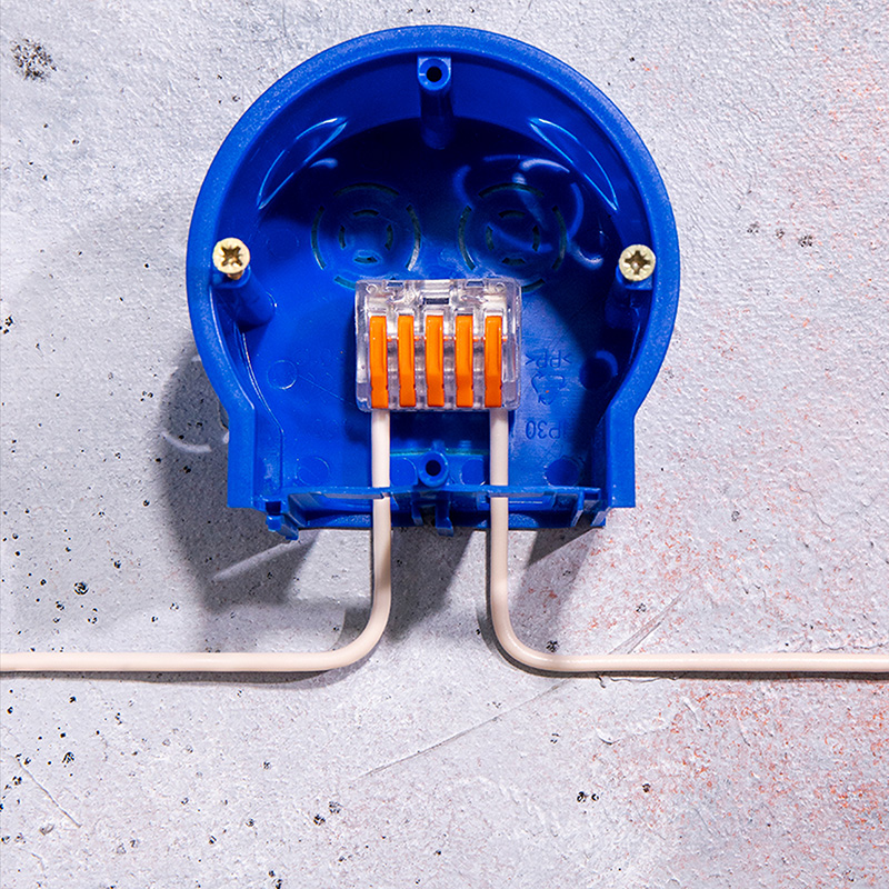 Перед монтажом с соединяемых проводников необходимо снять изоляцию в соответствии с обозначениями на корпусе клеммы (9-12 мм). Зачищенный участок с монтажной стороны не должен иметь сильных изгибов. Вставьте его в свободное гнездо клеммы, предварительно подняв оранжевый рычажок, после этого опустите рычажок в исходное положение. Контакт осуществляется путем зажима проводника пластиной. Конструкция предотвращает случайное размыкание контакта. Специальное технологическое отверстие на корпусе клеммы предназначено для проверки соединения тестером-пробником или щупом мультиметра. Оболочка из прозрачного пластика делает контакт изолированным, а также позволяет визуально оценить положение проводника.