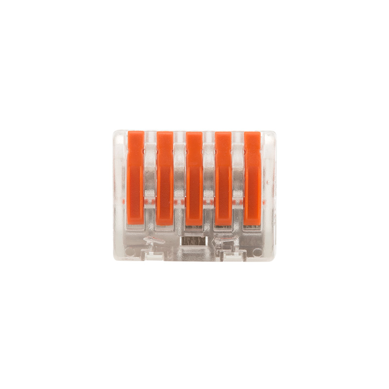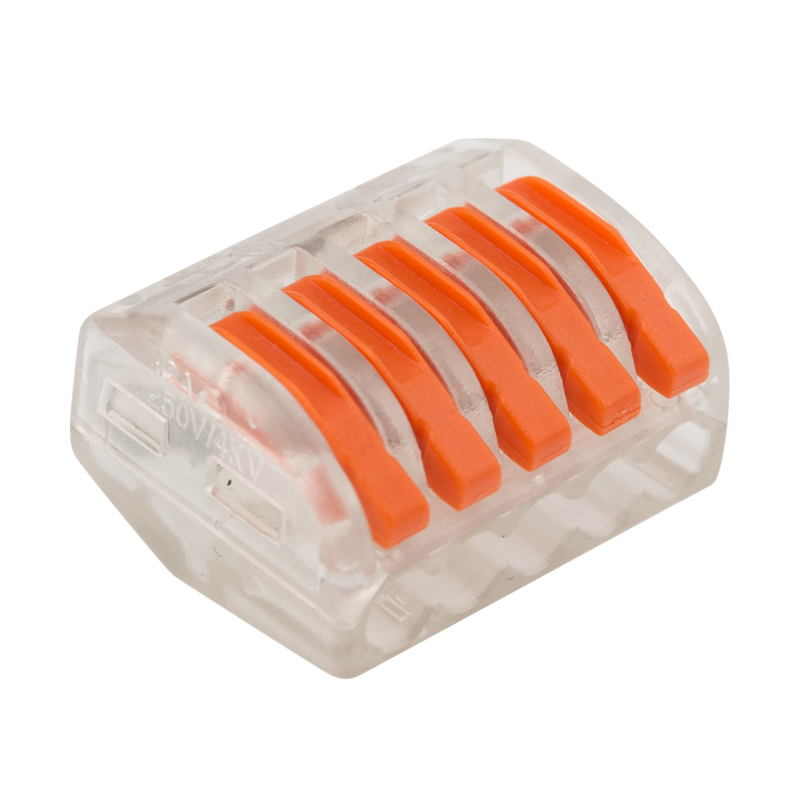 Соединительная многоразовая клемма REXANT на 5 проводников с плоско-пружинным зажимом предназначена для подсоединения медных одножильных и многожильных зачищенных проводников тонкого сечения.