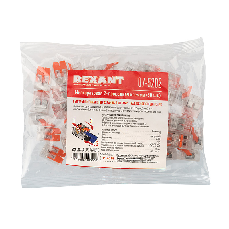 Многоразовая 2-проводная клемма REXANT — это один из самых быстрых, надежных и удобных способов монтажа проводников при небольшой потребности в пространстве в точке коммутации, в условиях нехватки и ограничения пространства. Конструкция на 30 % компактнее привычных рычажковых клемм, прозрачный корпус позволяет контролировать контакт проводников с контактными пластинами, правильность зачистки проводников. Широкие плоские рычаги с меньшим прижимным усилием более удобны и надежны в работе, наличие двух гнезд для тестовых щупов с обеих сторон клеммы облегчает доступ и контроль соединения и питания.