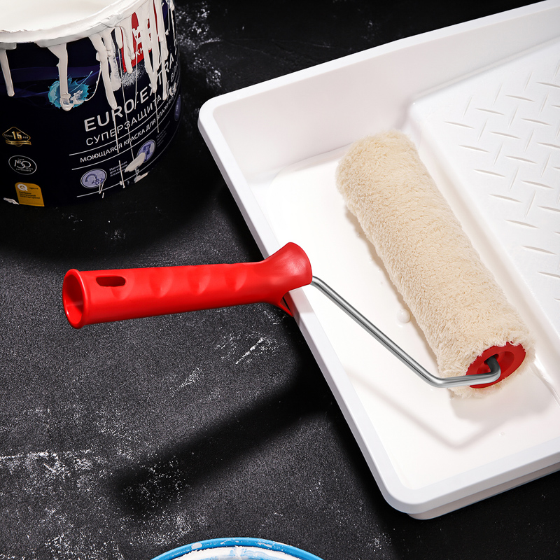 Валик состоит из пластмассового цилиндра, мягкой шубки, бугеля (изогнутого металлического стержня) и удобной пластиковой рукоятки.