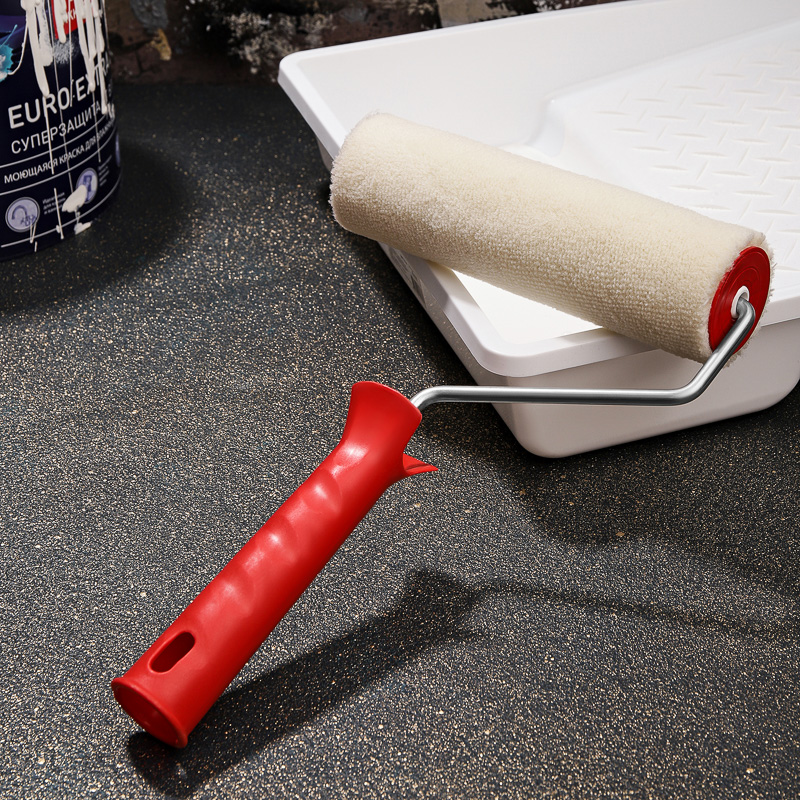 Валик состоит из пластмассового цилиндра, мягкой шубки, бугеля (изогнутого металлического стержня) и удобной пластиковой рукоятки.