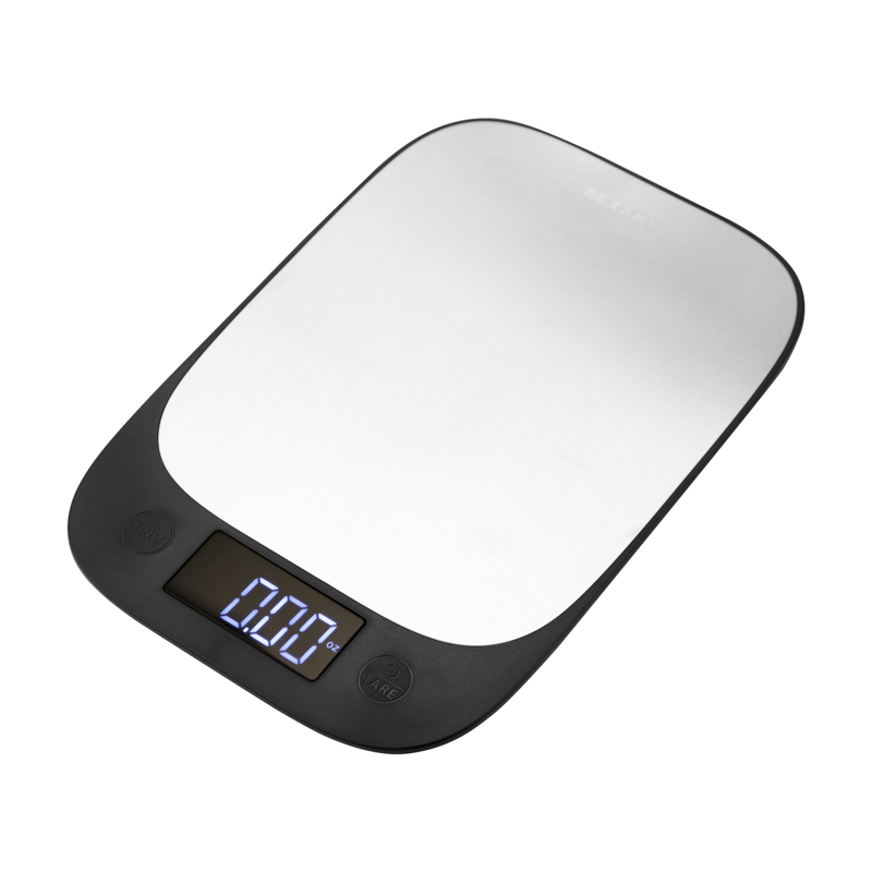 Весы кухонные электронные. Платформа из нержавеющей стали. LCD дисплей, точность измерения 1 грамм, максимальный груз 5 кг. Питание от 3 батареек тип AAA.