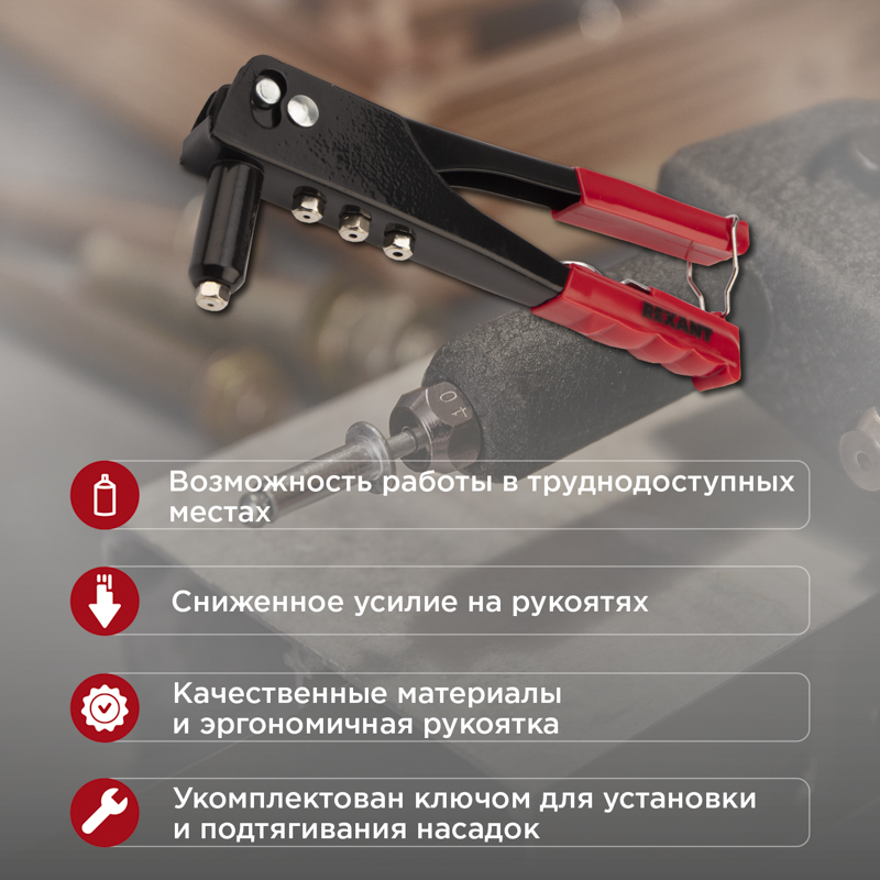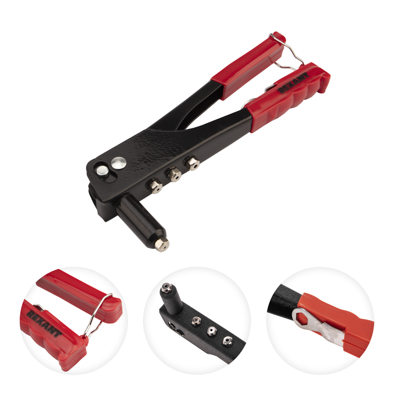 Заклепочник REXANT применяется для скрепления 2 и более деталей в труднодоступных местах. Подходит для скрепления предметов из металла, древесины, пластмассы, кожи. Оснащен 4 насадками разного диаметра под соответствующие заклепки.