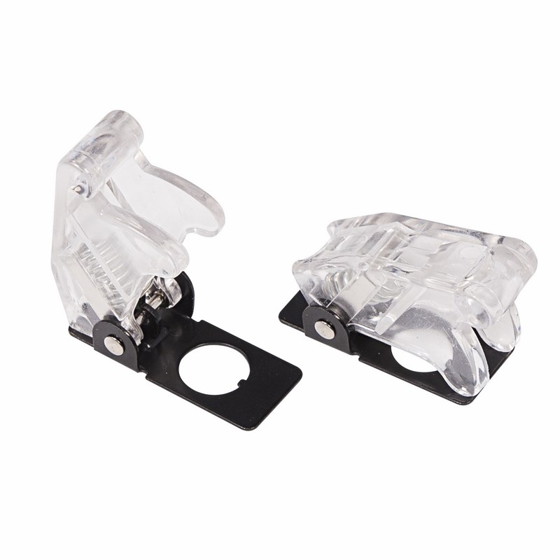 Защитная крышка для тумблеров типа KN и ASW прозрачная предназначена для защиты от случайной коммутации переключателя во включенное положение. Устанавливается без применения дополнительного крепежа совместно с тумблерами типа KN или ASW на лицевых панелях управления электрооборудованием (в измерительных приборах, блоках питания, электроустановках на различных производствах, легковых и грузовых автомобилях, поездах и многих других местах). Защита тумблера состоит из двух основных частей, соединенных пружинным механизмом: металлической пластины с круглым отверстием (Ø12мм) для установки на переключатель и пластмассовой крышки. Пружинный механизм удерживает крышку в закрытом, либо открытом положении. Для переключения в открытое положение требуется приложить некоторые усилия. Разнообразные цветовые варианты исполнения защитной крышки позволяют эффективно комплектовать панели управления.