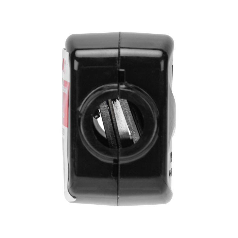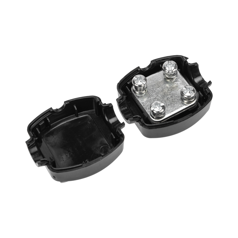 Это компактное приспособление представляет собой пластиковый короб с двумя входами. Внутри расположен зажим кулачкового типа, затягиваемый болтами. При монтаже достаточно снять изоляцию с магистрального провода и ответвительной жилы без их разрезания, благодаря чему увеличивается надежность электрического контакта.